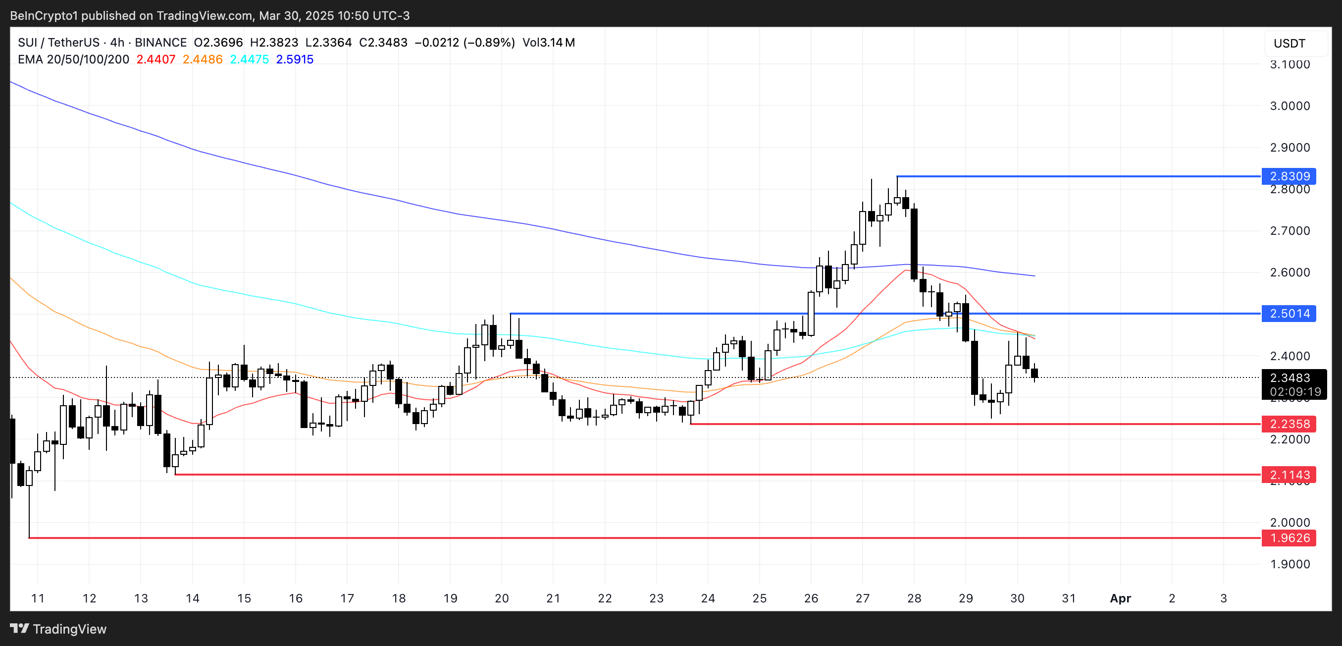 SUI:s EMA-linjer har nyligen bildat ett dödskors, vilket antyder en möjlig nedåttrend. Om det bekräftas kan priset sjunka till 2,23 USD, med ytterligare nedgång till 2,11 USD och 1,96 USD.