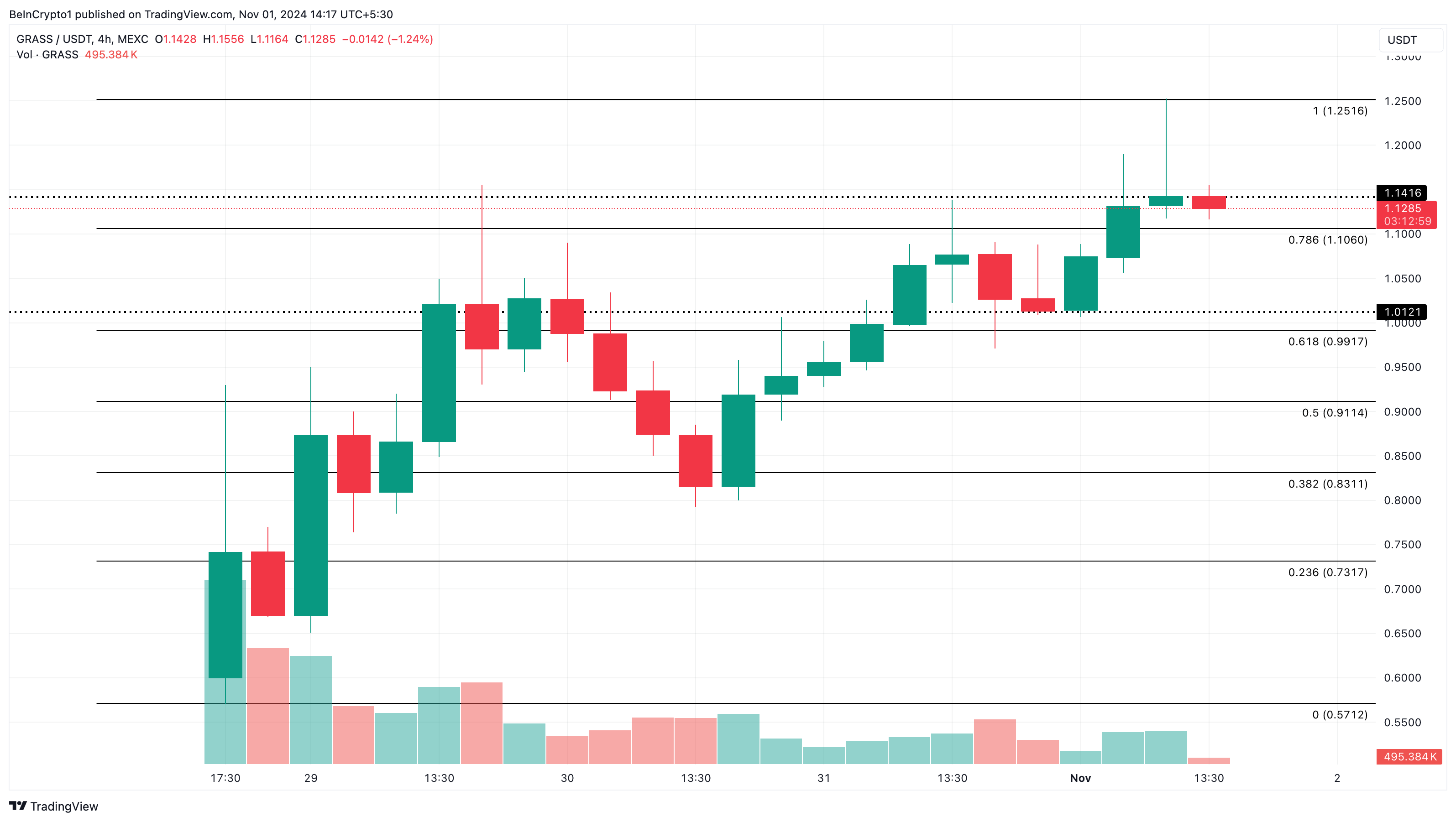 Enligt CoinGecko har GRASS pris ökat med 9,30 % och handlas för närvarande till 1,13 USD. Även om altcoinen möter motstånd runt 1,13 USD, visar 4-timmarsdiagrammet att stöd vid 1,01 USD kan hjälpa den att studsa tillbaka.