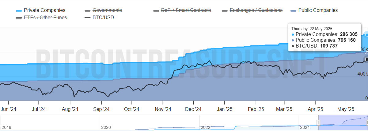 Data från Bitcoin Treasuries visar att privata och offentliga företag nu håller över 1 miljon BTC—mer än 5,4 % av den cirkulerande mängden. Samtidigt förblir bitcoins utbud fast, och antalet företag som ackumulerar det fortsätter att växa varje månad.