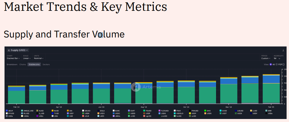 Artemis och Dune Analytics genomförde en rapport om stabila myntens tillstånd 2025, och undersökte tillgång, användning och marknadstrender. Enligt resultaten har den totala tillgången på stabila mynt nått 214 miljarder USD, med upp till 35 biljoner USD i överföringar det senaste året.