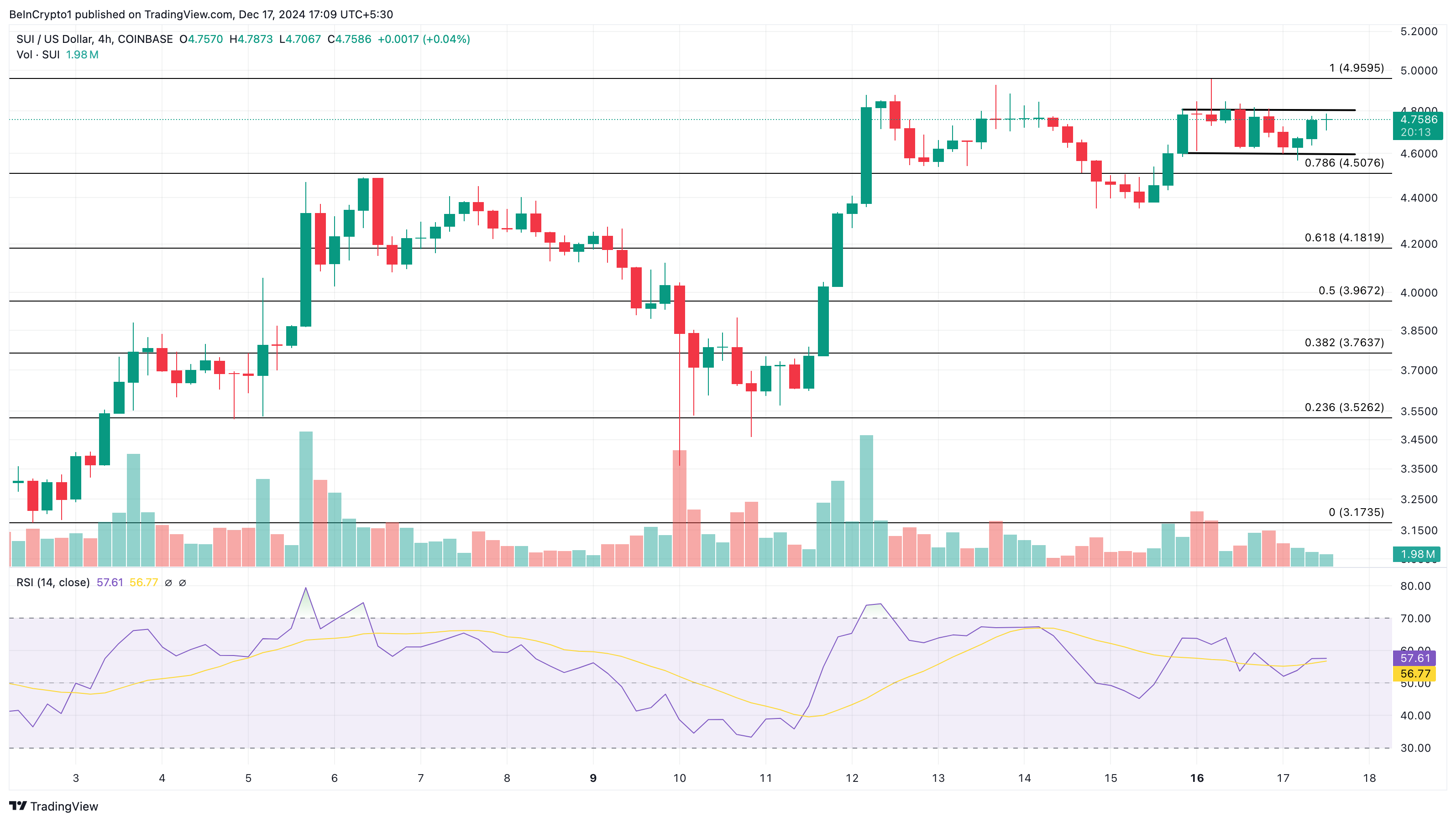 Sedan söndagen har SUI handlats mellan 4,60 USD och 4,80 USD, vilket indikerar osäkerhet bland köpare och säljare. Detta Relative Strength Index (RSI), en teknisk indikator som mäter momentum, bekräftar också denna tendens.
