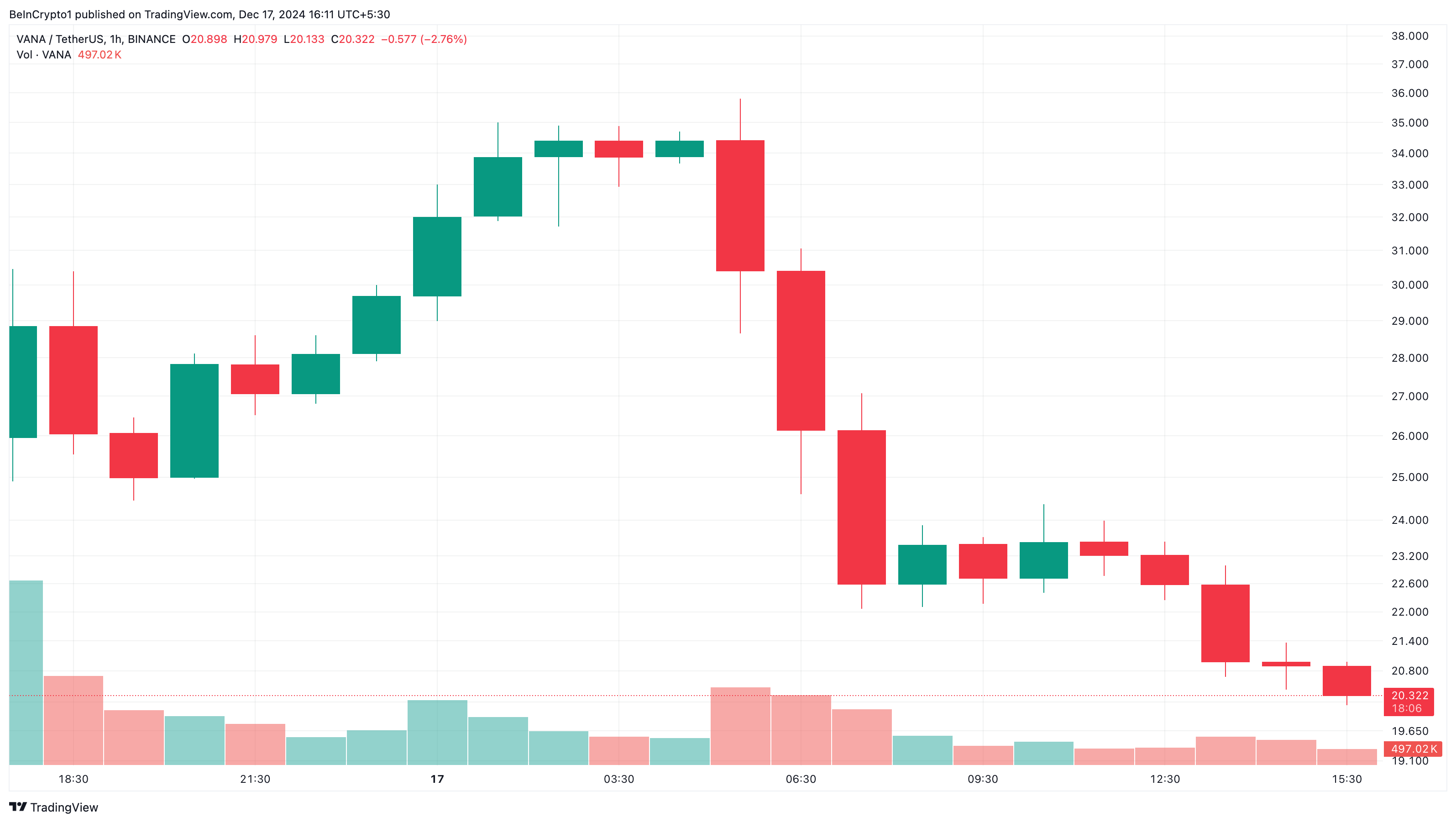 För det andra, medan flera kryptobörser listade token, sköt Binance upp det några timmar på grund av tekniska problem och regleringsfrågor. Efter denna utveckling har VANA:s pris sjunkit med 15 % de senaste 24 timmarna.