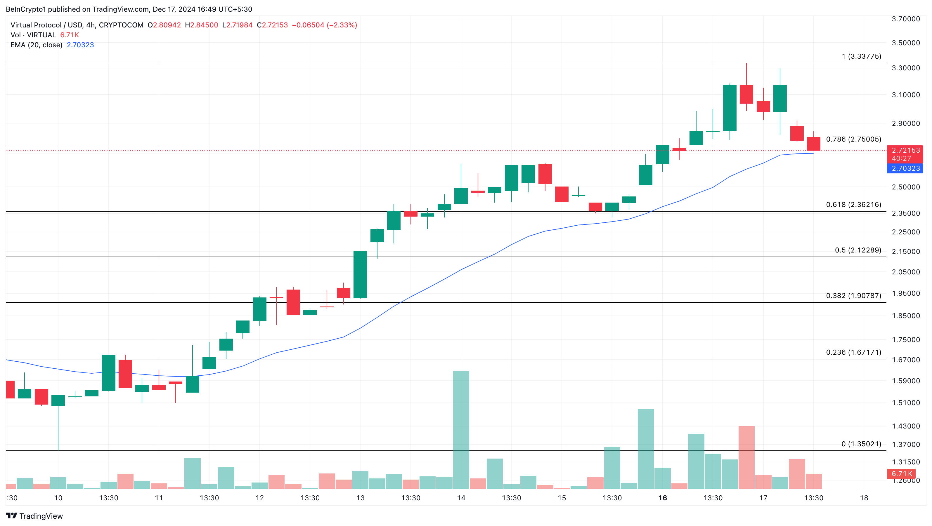 Om det bekräftas kan VIRTUAL:s pris sjunka till 1,91 USD. Men om köparna hindrar token från att falla under 20 EMA kan priset stiga till 3,34 USD.