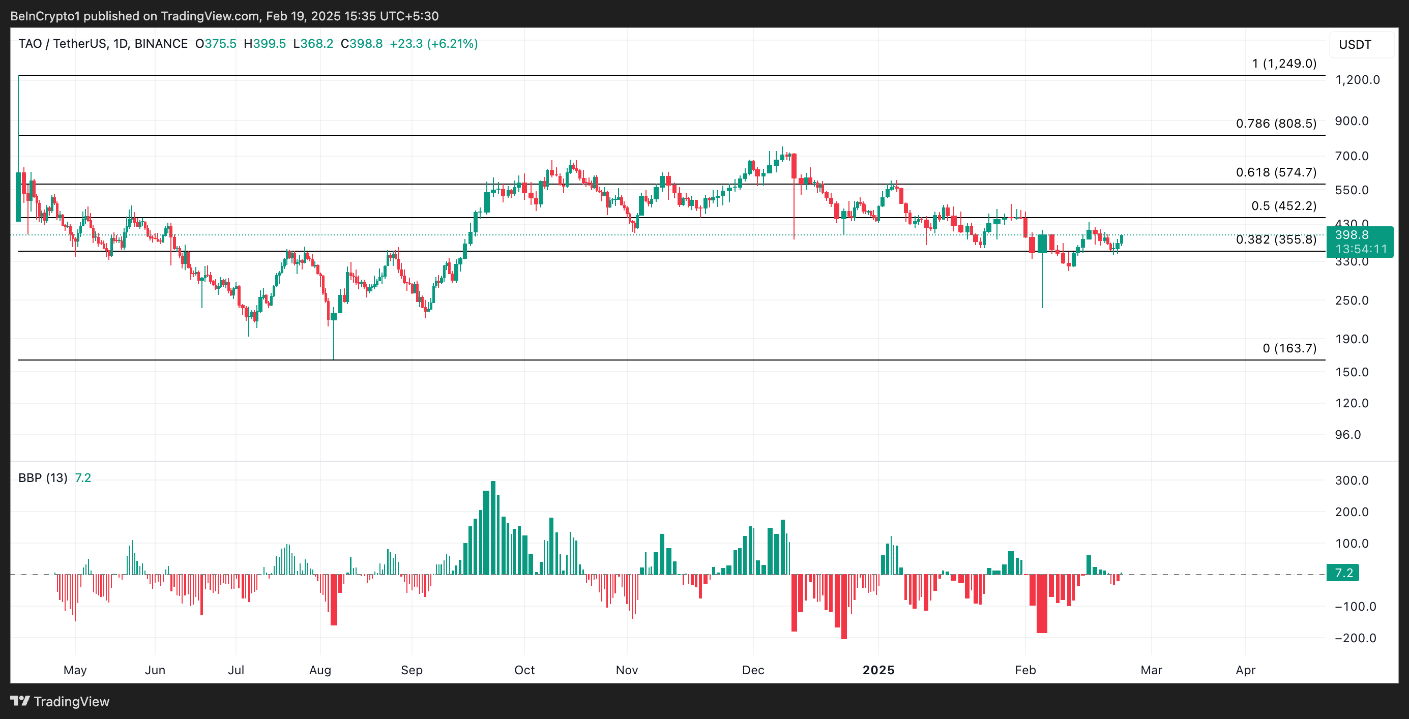 Detta index mäter styrkan hos tjurar och björnar på marknaden. När dess värde är positivt betyder det att tjurarna har kontroll. Detta signalerar stark köpkraft på TAO-marknaden och antyder potential för ytterligare uppgång.