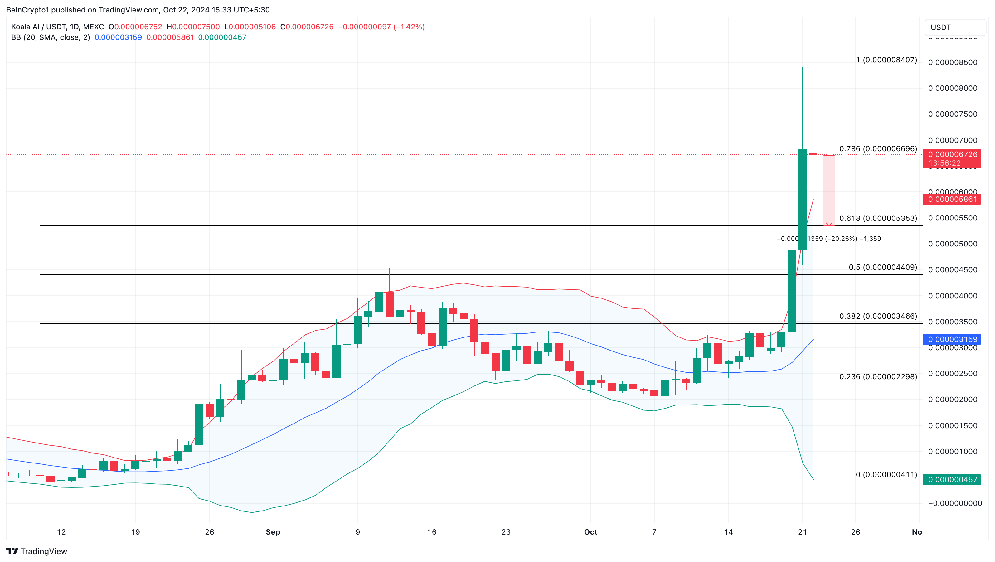 Under de senaste 24 timmarna har KOKO:s pris ökat med 125% och ligger för närvarande på 0,0000067 USD. Baserat på det dagliga diagrammet har Bollinger Bands (BB) expanderat, vilket indikerar en hög nivå av volatilitet kring kryptovalutan.