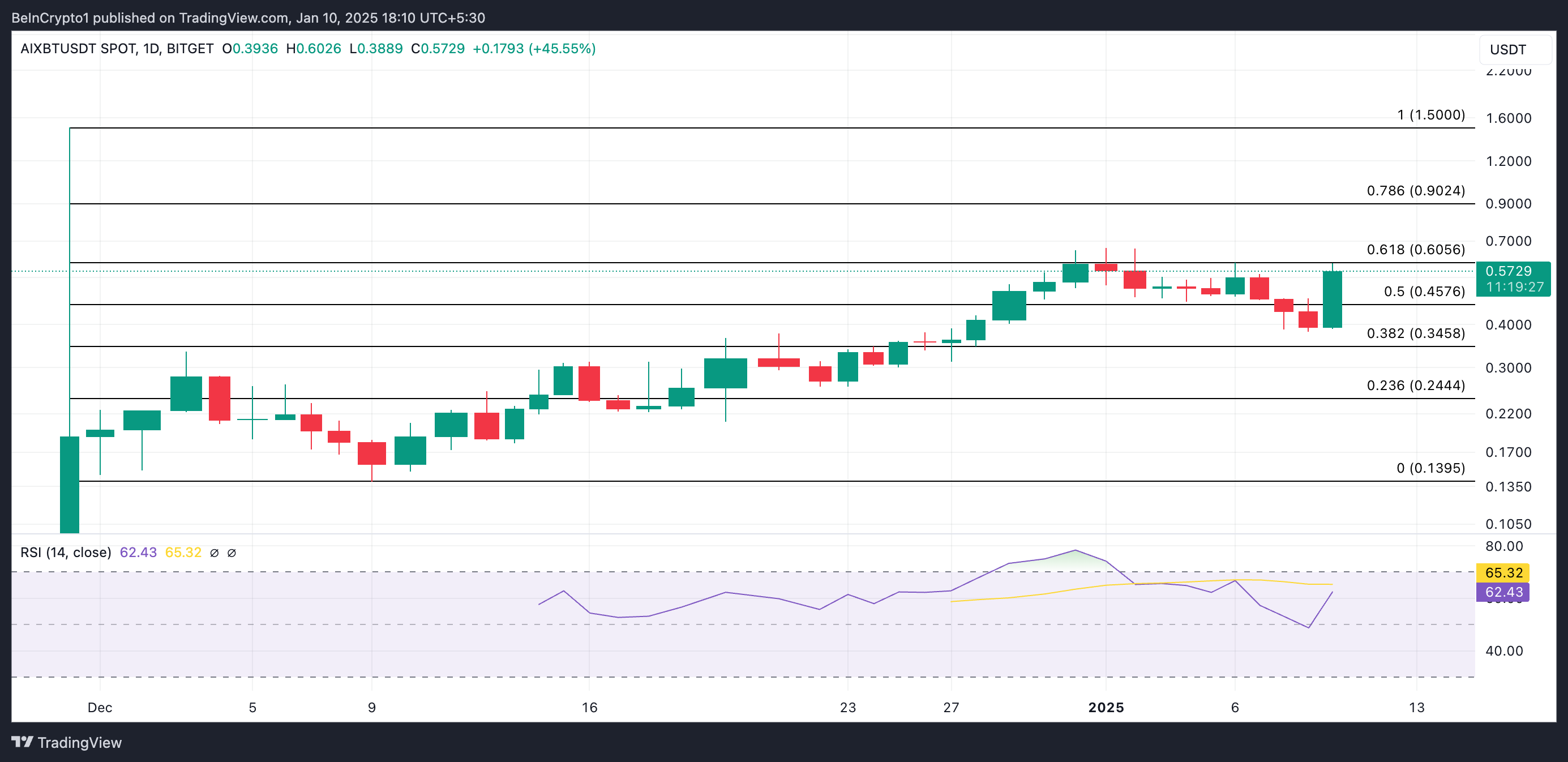 Analys av dess Relative Strength Index (RSI) på endagsdiagrammet bekräftar den ökande efterfrågan på AI-baserad token. Vid pressens tidpunkt ligger den på 62,43.