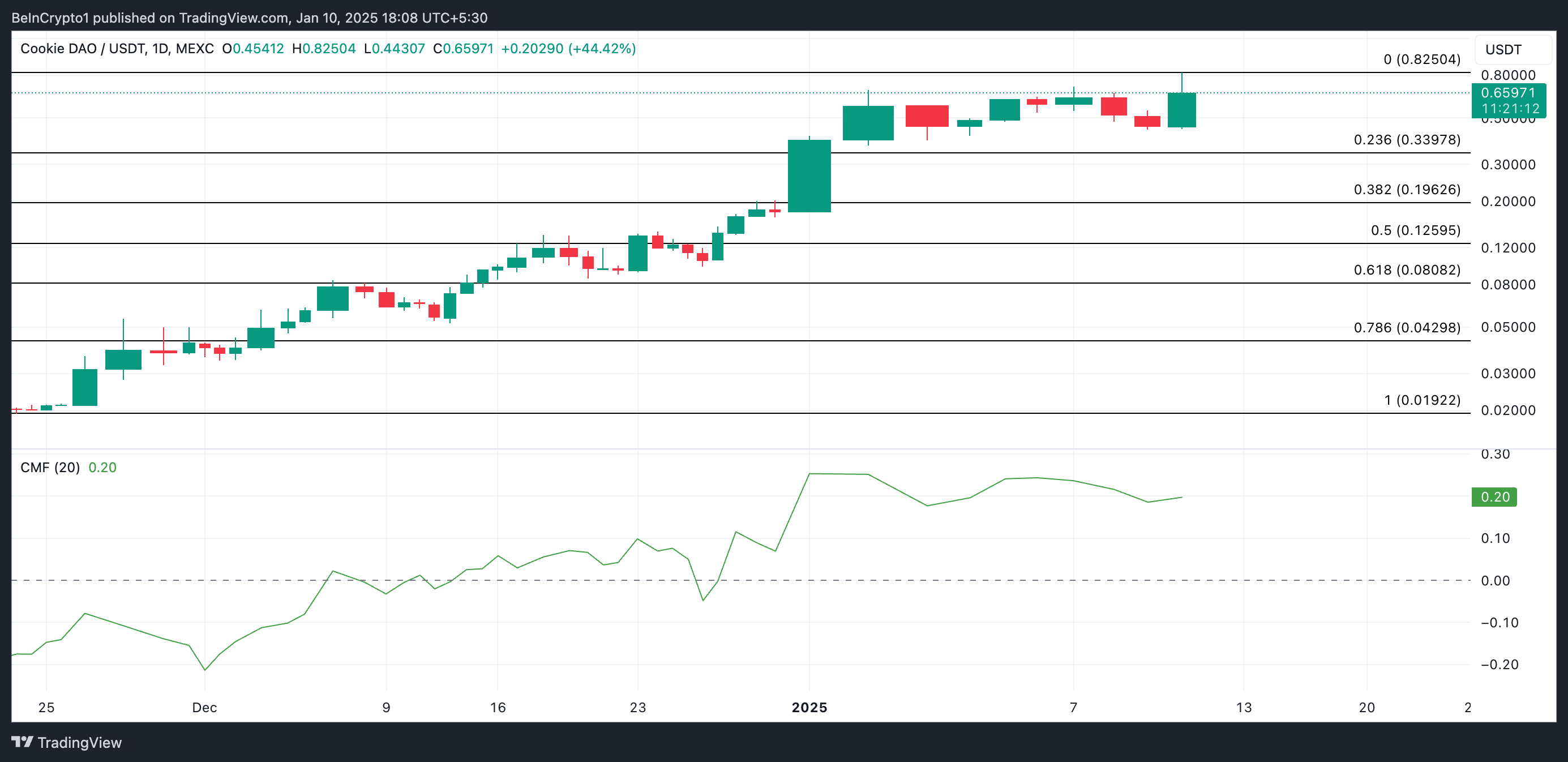 COOKIE nådde en rekordhög nivå på 0,82 USD under fredagens tidiga asiatiska session. Priset har sedan dess korrigerats med 13 % till 0,65 USD vid pressens tidpunkt, men den positiva inställningen till den är fortfarande stark. Den har ökat med 42 % de senaste 24 timmarna.