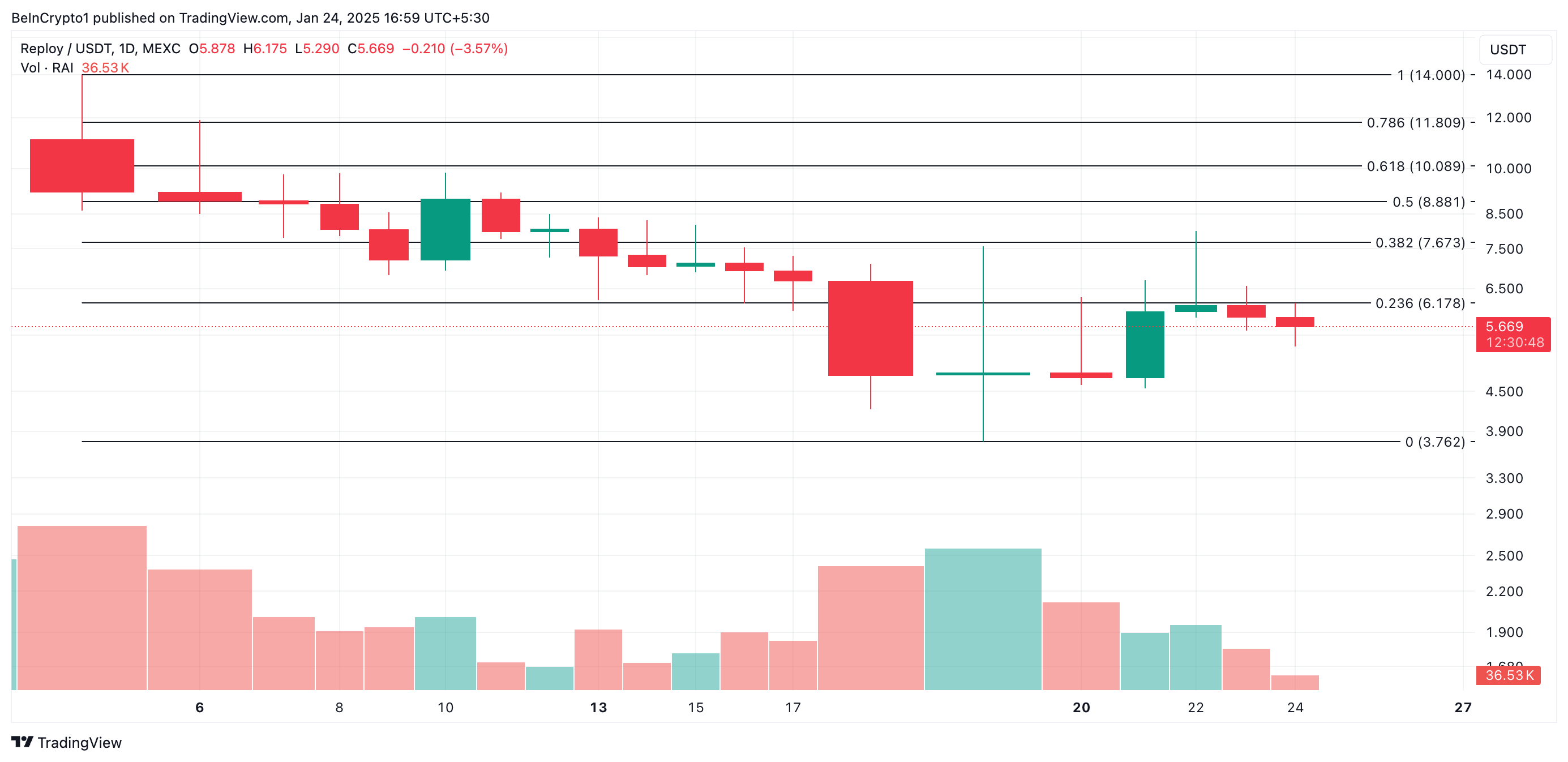 RAI:s pris kan sjunka mot 3,76 USD när det nedåtgående trycket ökar. Omvänt kan en ökning i RAI-efterfrågan driva tokenens värde upp till 7,67 USD.