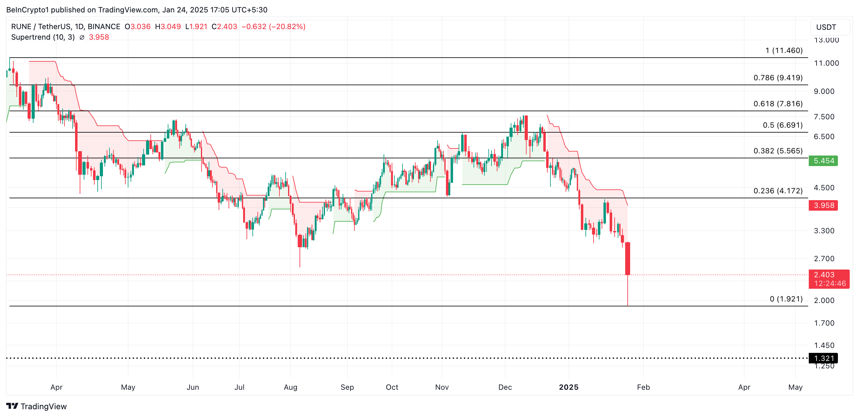 THORChains RUNE handlas för närvarande till sitt lägsta pris sedan oktober. Under de senaste 24 timmarna har dess värde sjunkit med 19 %. Vid 2,40 USD ligger RUNE under den röda linjen i sin Super Trend-indikator, vilket signalerar starkt björntryck på marknaden.