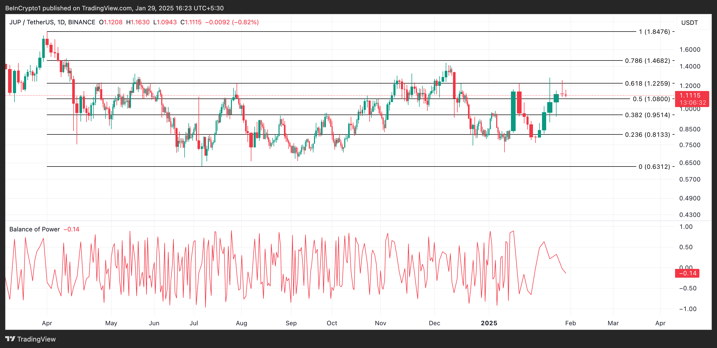 JUP handlas för 1,11 USD just nu, med en nedgång på 7 % under de senaste 24 timmarna. Dess negativa Balance of Power (BoP) på -0,14 bekräftar ökningen i försäljningstrycket.
