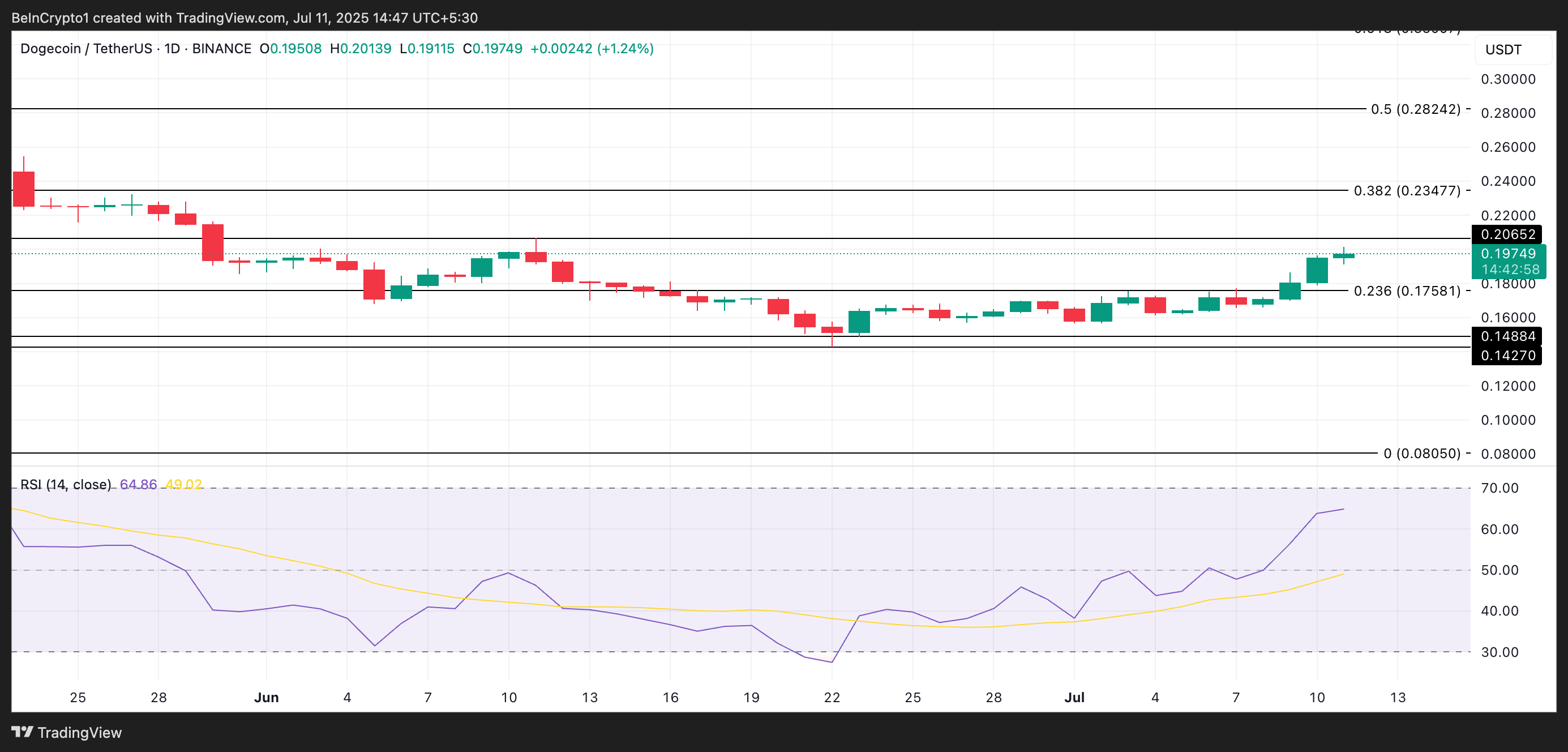 Vid pressens tidpunkt handlas DOGE för 0,197 USD, upp 18 % under den senaste veckan. På det dagliga diagrammet är dess Relative Strength Index (RSI) 64,86 och stiger, vilket indikerar starkt köpside-tryck.