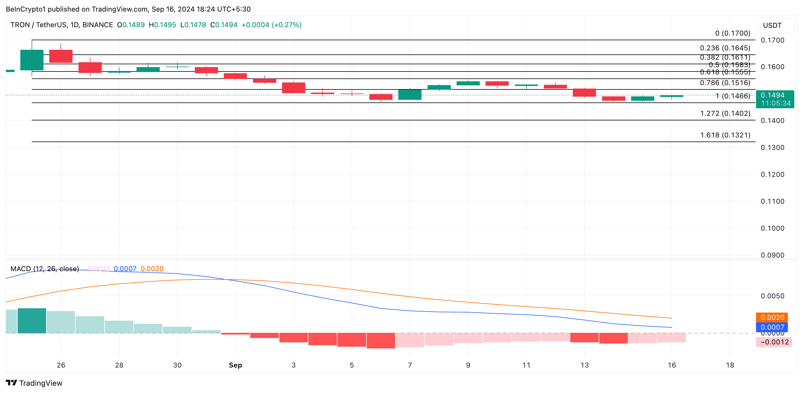 Trons prisnedgång sedan den 25 augusti har lett till bildandet av en nedåtgående kanal, ett baisseartat mönster som kännetecknas av lägre höjder och lägre lågpunkter. Den övre linjen i kanalen fungerar som motstånd, för närvarande på 0,14 USD för TRX, medan den nedre linjen fungerar som stöd, också på 0,14 USD.