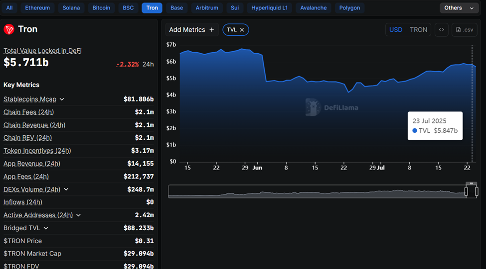 Trots hypen kring evenemanget har Tron TVL minskat med 136 miljoner USD, från 5 847 miljarder USD på meddelandedagen till 5 711 miljarder USD i skrivande stund.