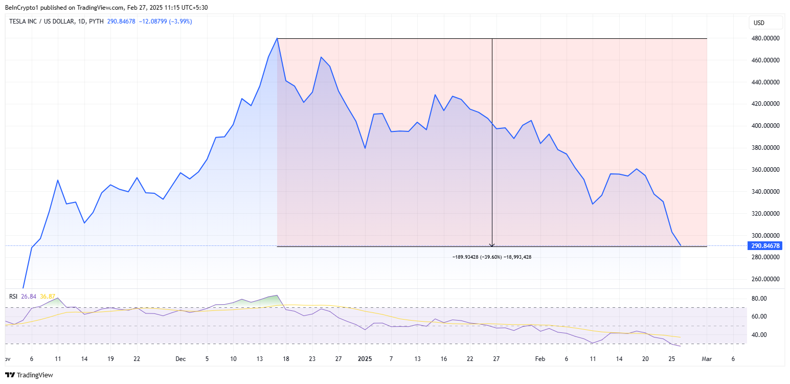 Tesla, som ofta ses som en barometer för den så kallade ‘Trump-handeln’, har upplevt en kraftig nedgång. Dess aktie, TSLA, har sjunkit nästan 40 % sedan sin topp efter Trumps valvinst. Elbilsjätten föll nästan 4 % den 26 februari. Denna nedgång förlängde en förlustsvit som har sett dess aktie falla 24 % för året.
