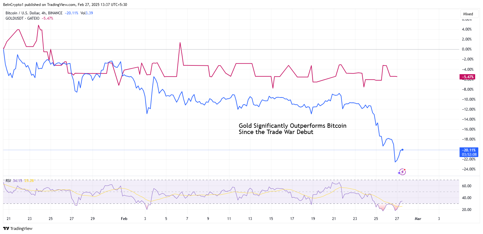 Samtidigt är en av de mest slående trenderna på finansmarknaderna den skarpa skillnaden mellan Bitcoin och guld. Medan guld har stigit 10 % nyligen, har Bitcoin sjunkit 10 %, trots att det historiskt sett betraktas som en säkring mot ekonomisk osäkerhet.
