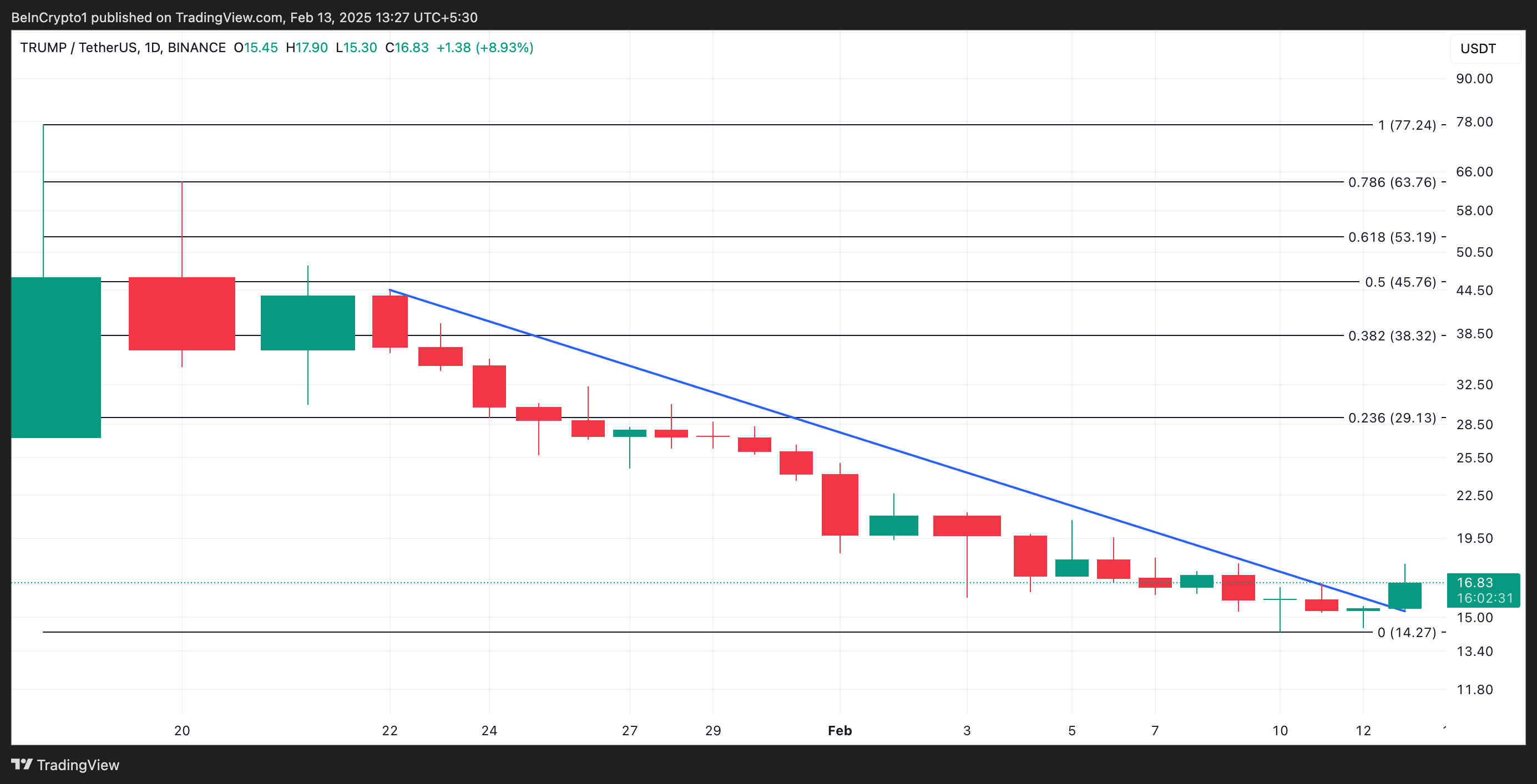 Den gradvisa återhämtningen i handelsaktivitet på kryptomarknaden har lett till en tvåsiffrig ökning i TRUMP:s värde. Vid pressen handlas tokenen för 16,87 USD.