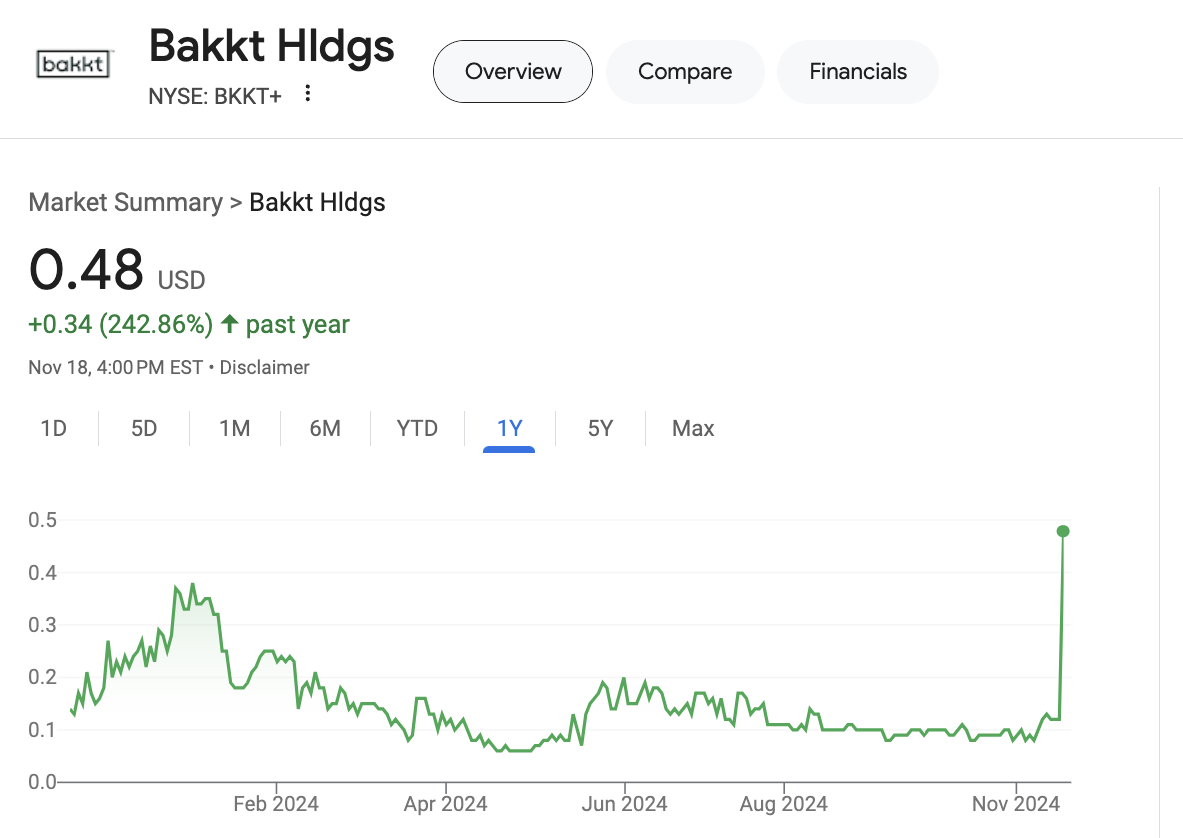 Trump Media, som är Donald Trumps företag inom sociala medier och teknik, för närvarande samtal om att köpa Bakkt, en kryptobörs. Bakkts betydelse i branschen var som störst för några år sedan, och har sedan dess beskrivits som en “marginal aktör inom området.” Tidigare i år övervägde de försäljning eller uppdelning. Sedan detta erbjudande har dock deras aktiekurs skjutit i höjden.