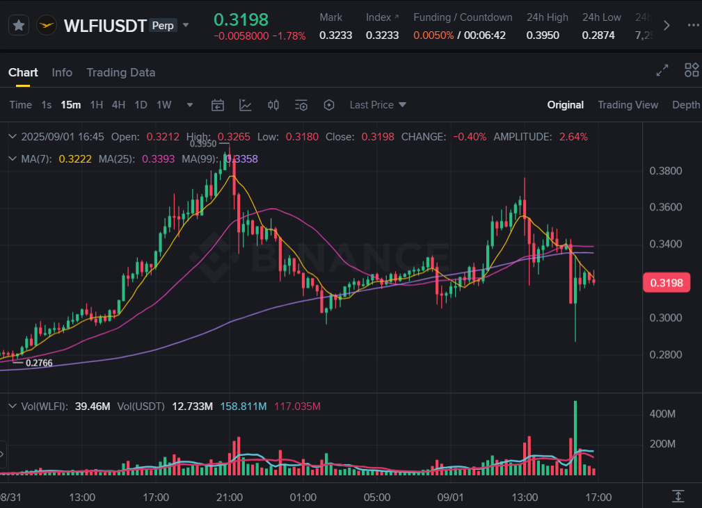 Trots nyheterna om de stora börslistningarna har WLFI:s pris visat märkbar svaghet. Enligt prisdata från Binance sjönk WLFI-USDT-derivatpar till en låg nivå av 0,2874 USD vid ett tillfälle.
