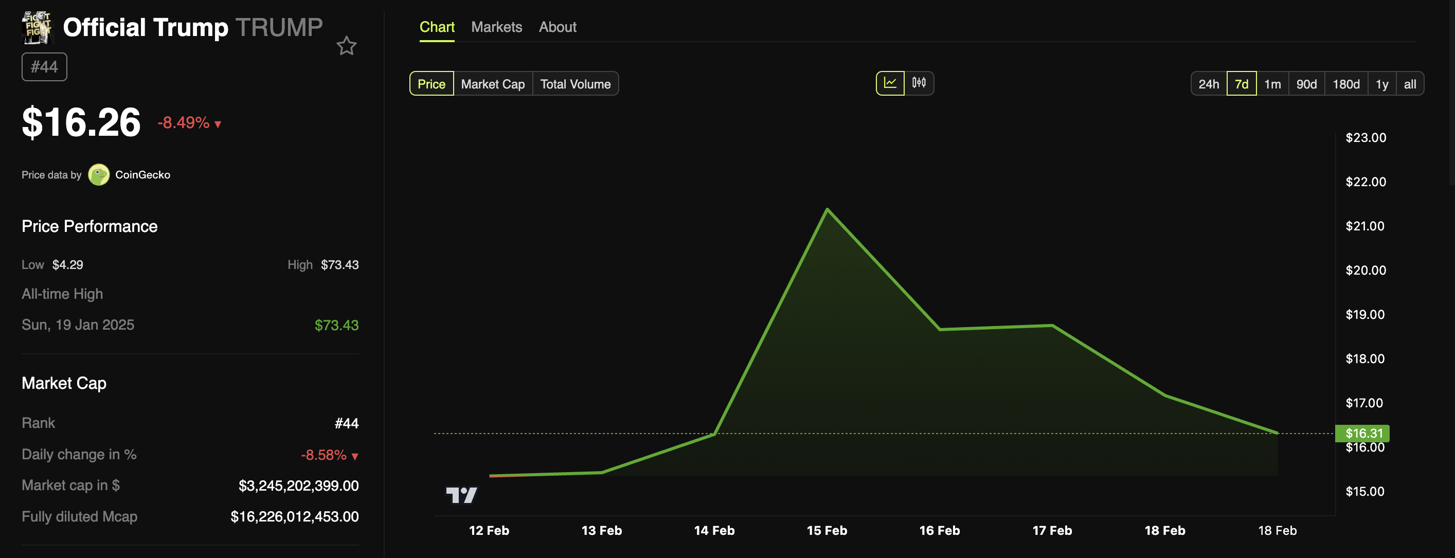 Enligt de senaste uppgifterna har TRUMP-myntet fortsatt sin nedåtgående trend efter en kort återhämtning förra veckan. Vid skrivande stund handlades det för 16,2 USD, vilket återspeglar en nedgång på 77,6 % från sin rekordhöga nivå.