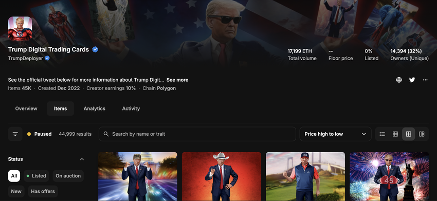 Enligt OpenSea-data nådde den totala handelsvolymen för Trump Digital Trading Cards 17 167 ETH, motsvarande tiotals miljoner USD—en imponerande siffra för en NFT-kollektion.