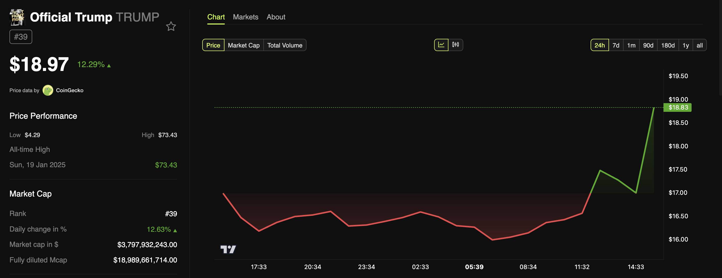 Efter Hayes kommentarer började TRUMPs pris återhämta sig. Memecoinen steg med tvåsiffriga tal, och ökade med 12,29 % under de senaste 24 timmarna. Mycket av dessa vinster registrerades under den senaste timmen.