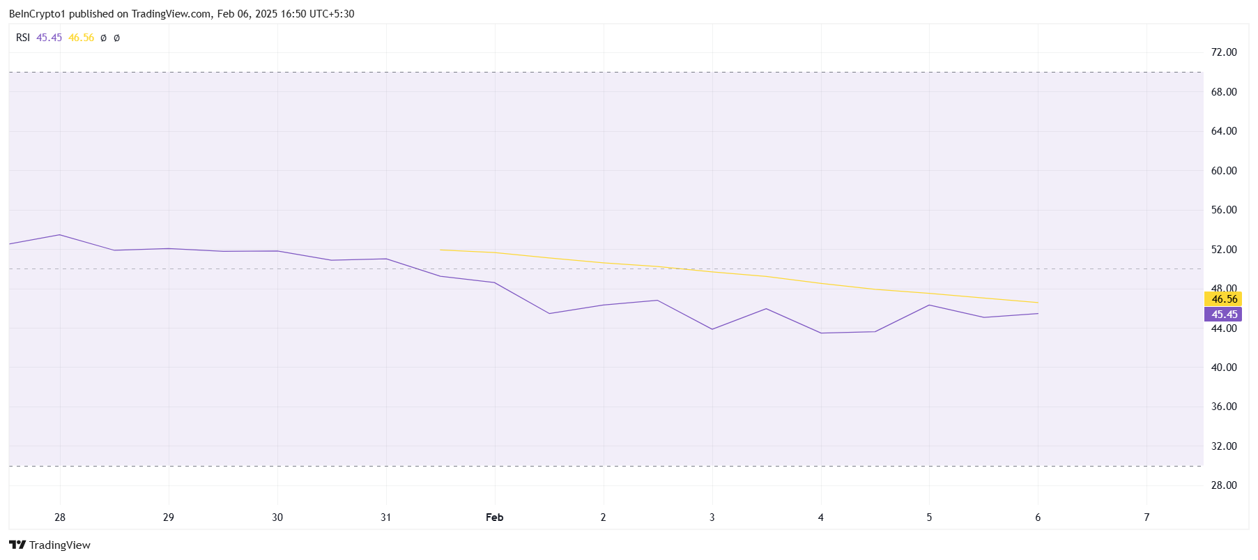 Tekniska indikatorer förstärker den negativa utsikten. Relative Strength Index (RSI) är för närvarande under den neutrala nivån 50,0. Detta signalerar ökat negativt momentum, där säljare har mer kontroll över prisriktningen.