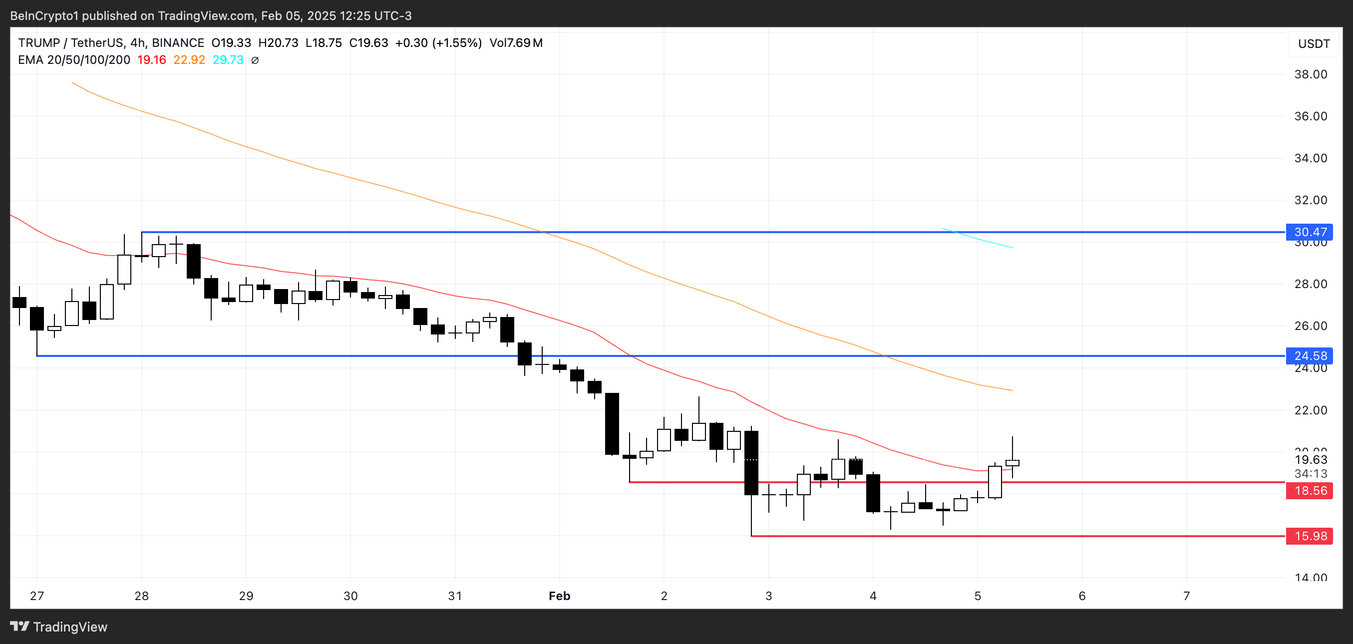 Om den nuvarande upptrenden håller i sig kan TRUMP-priset fortsätta sin återhämtning och testa motståndet vid 24,58 USD. Ett genombrott över denna nivå kan driva priset högre, med nästa stora mål runt 30,47 USD.