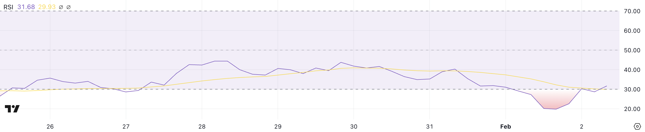 TRUMP RSI är för närvarande 31,68 och har legat under 50 de senaste sju dagarna, med en lågpunkt på 19,8 den 1 februari. Denna långa period av svag RSI tyder på ihållande säljtryck, eftersom token har haft svårt att skapa tillräckligt momentum för en betydande återhämtning.