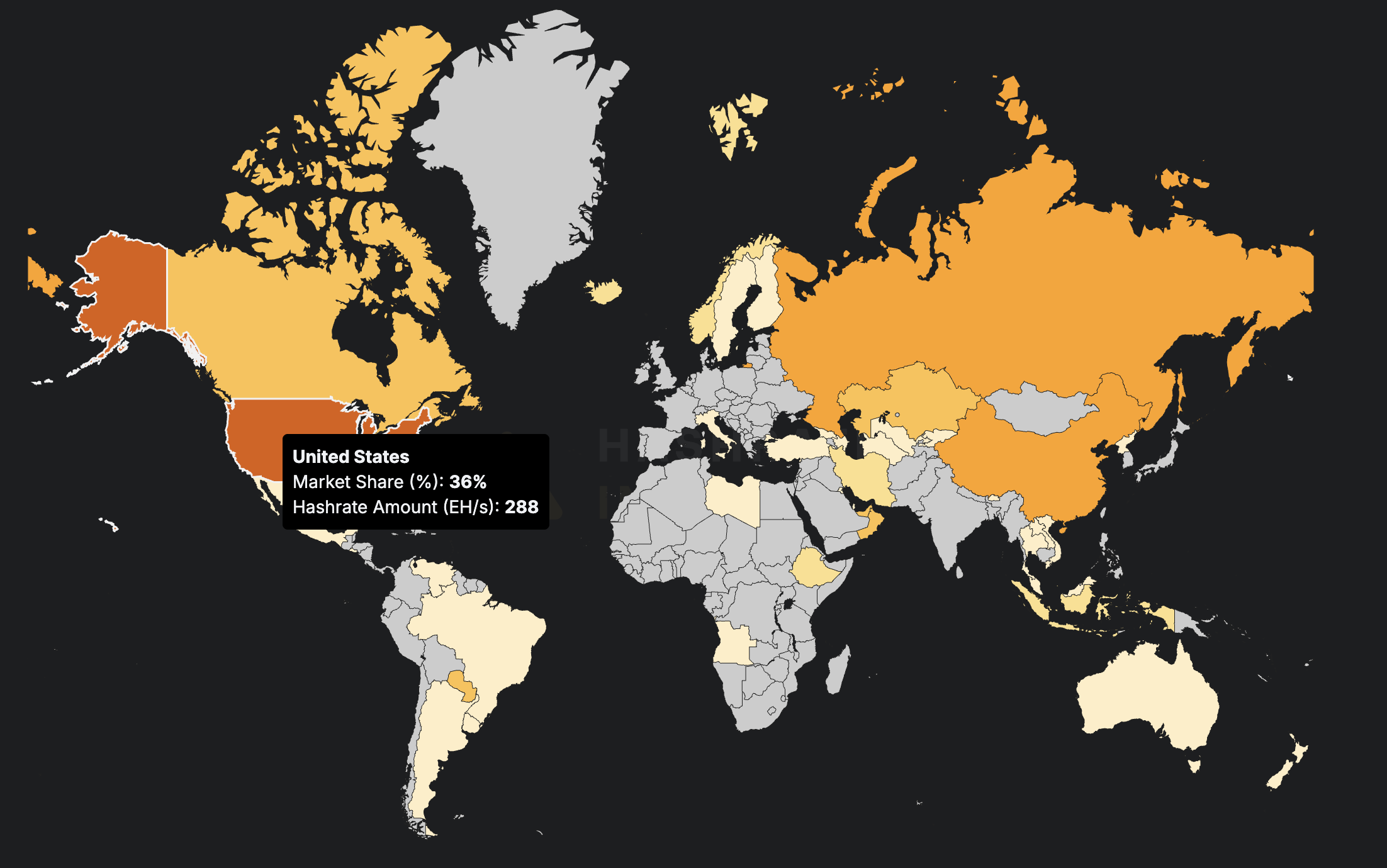 Samtidigt går konsekvenserna av Trumps tullhöjningar bortom bara stigande priser på Bitcoin-gruvutrustning. USA, som för närvarande står för cirka 36 % av den globala Bitcoin-gruvhashraten, riskerar att se sin marknadsandel krympa.
