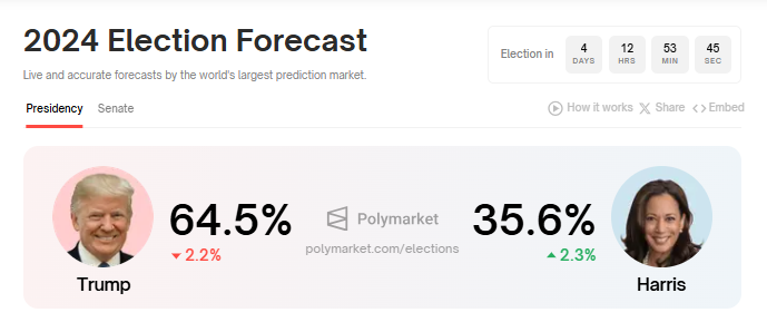 För närvarande leder Trump med 64,5% mot 35,6% för Kamala Harris. Dock rapporterade Fortune, med hänvisning till blockchain-forskningsföretagen Chaos Labs och Inca Digital, att plattformen kan påverkas av wash trading. Detta har skapat tvivel om Polymarkets odds legitimitet och noggrannhet.
