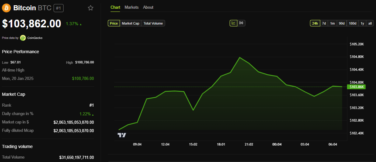 BeInCrypto-data visar att BTC handlades för 103 862 USD vid denna skrivning. Detta representerar en blygsam ökning på 1,37 % de senaste 24 timmarna.