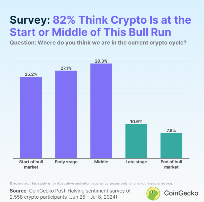 Enligt en CoinGecko-undersökning med 2 588 svarande tror 82 % att tjurrusningen inom krypto inte är över, och mer än 50 % tyder på att den fortfarande är i ett tidigt skede.