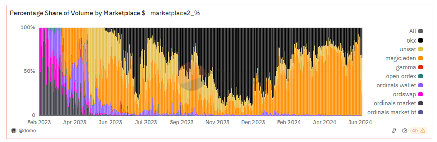 Vid sidan av denna kraftiga ökning fångade UniSat 43% av marknadsandelen bland Ordinals marknadsplatser samma dag. Det här är första gången sedan september 2023 som UniSat har överträffat marknadsandelen på 40%. Det överträffar konkurrenter som OKX och Magic Eden, som tidigare dominerade marknaden.
