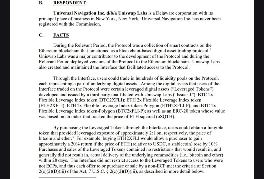 CFTC utfärdade en order och löste anklagelser mot Universal Navigation Inc., som driver Uniswap Labs, och krävde att företaget betalar en böter på 175 000 USD. Anklagelserna härrör från olagligt erbjudande av hävstångs- eller marginaliserade råvarutransaktioner i digitala tillgångar genom sin decentraliserade handelsprotokoll.