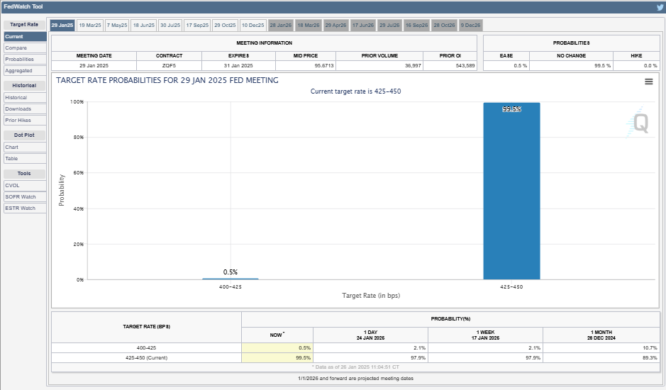 Mot denna bakgrund visar CME FedWatch-verktyget en 99,5% sannolikhet för en räntesänkning på 25 baspunkter (0,5% bps). Eftersom detta skulle innebära ingen ränteförändring, kommer fokus att ligga på presskonferensen med Fed-ordförande Jerome Powell. Med detta förväntar sig handlare och investerare högre volatilitet med marknadsrörande insikter från Fed-ordföranden.