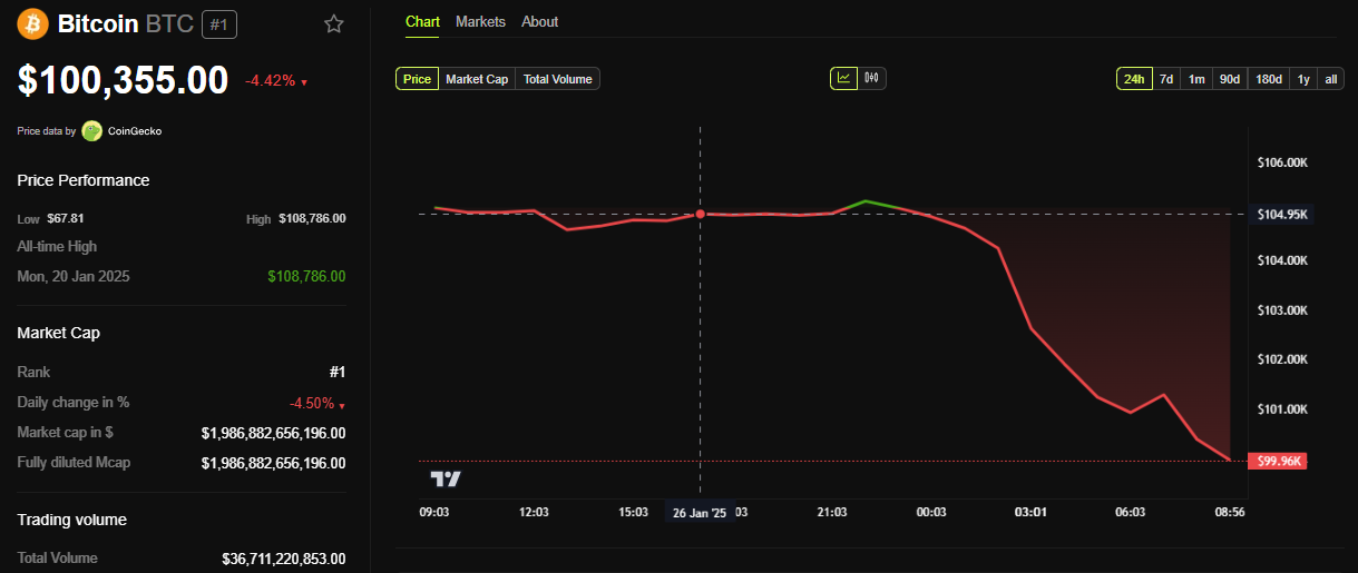 Inför dessa ekonomiska händelser i USA visar BeInCrypto-data att BTC handlades för 100 355 USD, ned nästan 5 % sedan måndagens session öppnade.
