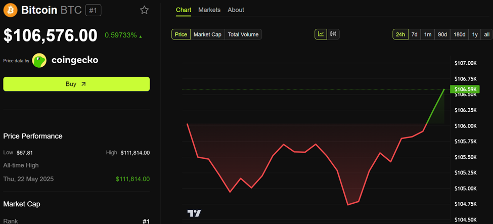 BeInCrypto-data visar att Bitcoin handlades för 106 576 USD vid denna skrivning, upp med nästan 1 % de senaste 2 timmarna.