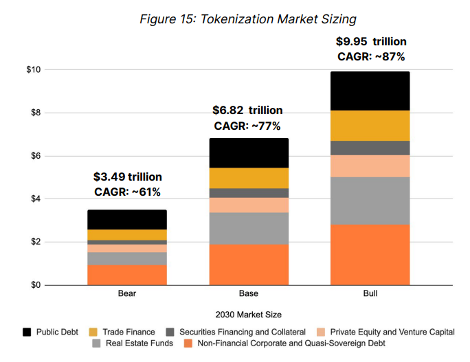 “Vi uppskattar att marknadsvärdet för tokeniserade tillgångar kommer att vara mellan 3,5 biljoner dollar i björnscenariot och 10 biljoner dollar i tjurfallet 2030. Marknadsvärdet härleds från den uppskattade penetrationsgraden för den totala adresserbara marknaden för olika tillgångsslag, inklusive icke-finansiella företagsskulder, fastighetsfonder, private equity, värdepapperssäkerhet, handelsfinansiering och offentliga skuldförbindelser, “rapporterade 21.co.