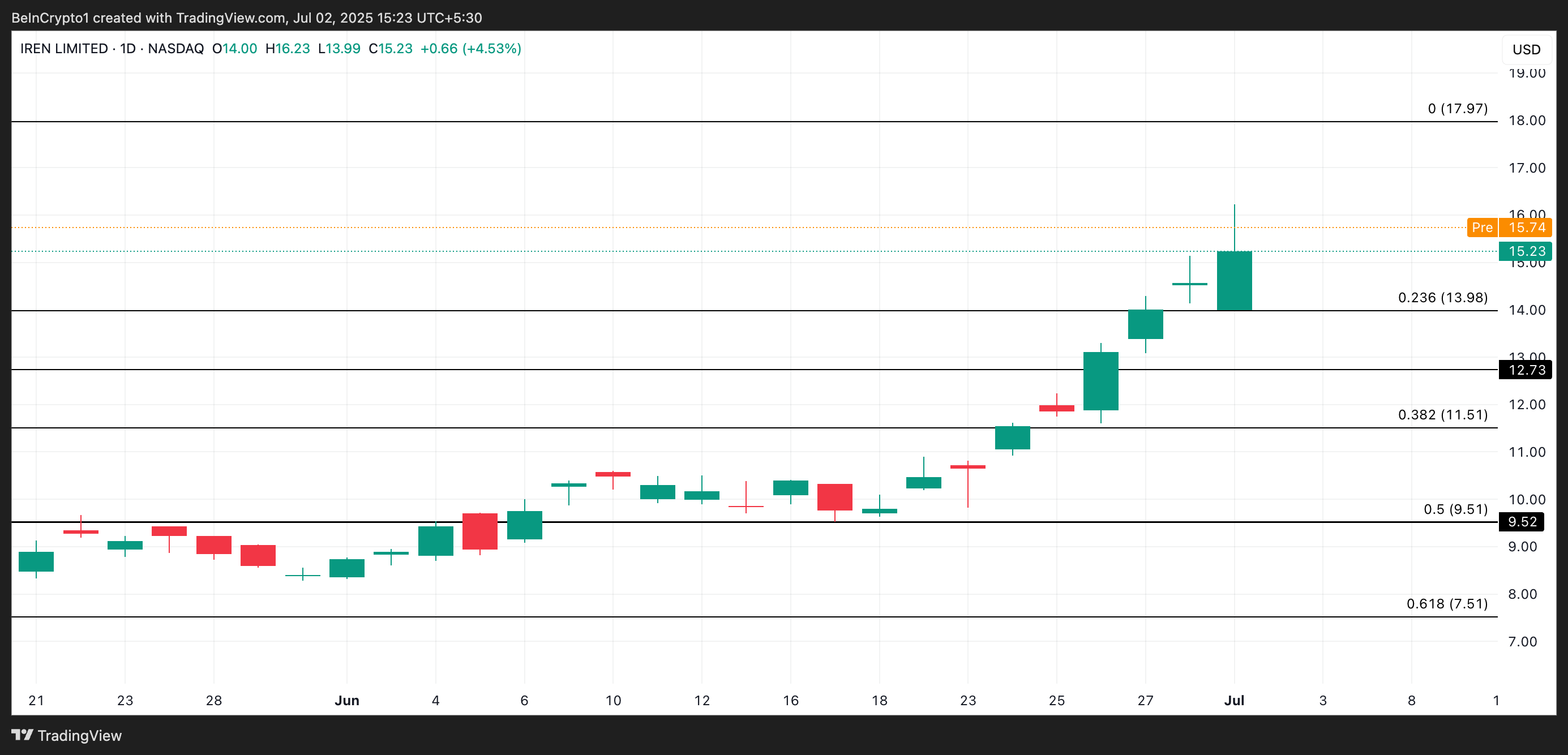 I förmarknadshandeln idag är IREN upp till 15,74 USD. Om den positiva efterfrågan håller i sig under sessionen kan aktien stiga ytterligare till 17,97 USD.