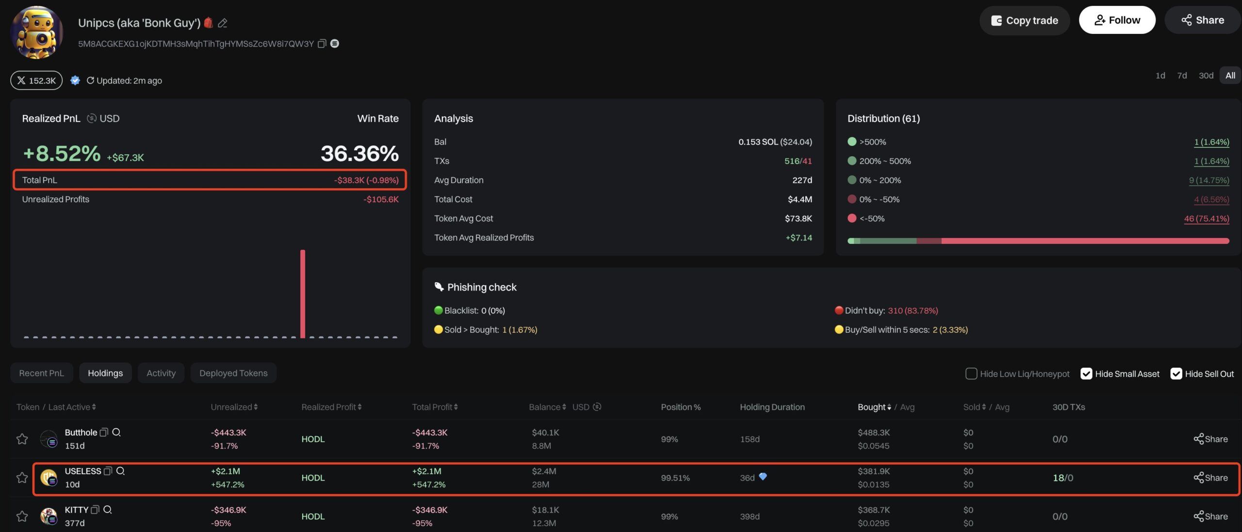 Enligt Lookonchain-data köpte en Bonk-communityfigur, Unipcs, 2,8 % av utbudet, eller 28,08 miljoner tokens. Valen förvärvade dessa USELESS tokens för 381 900 USD.