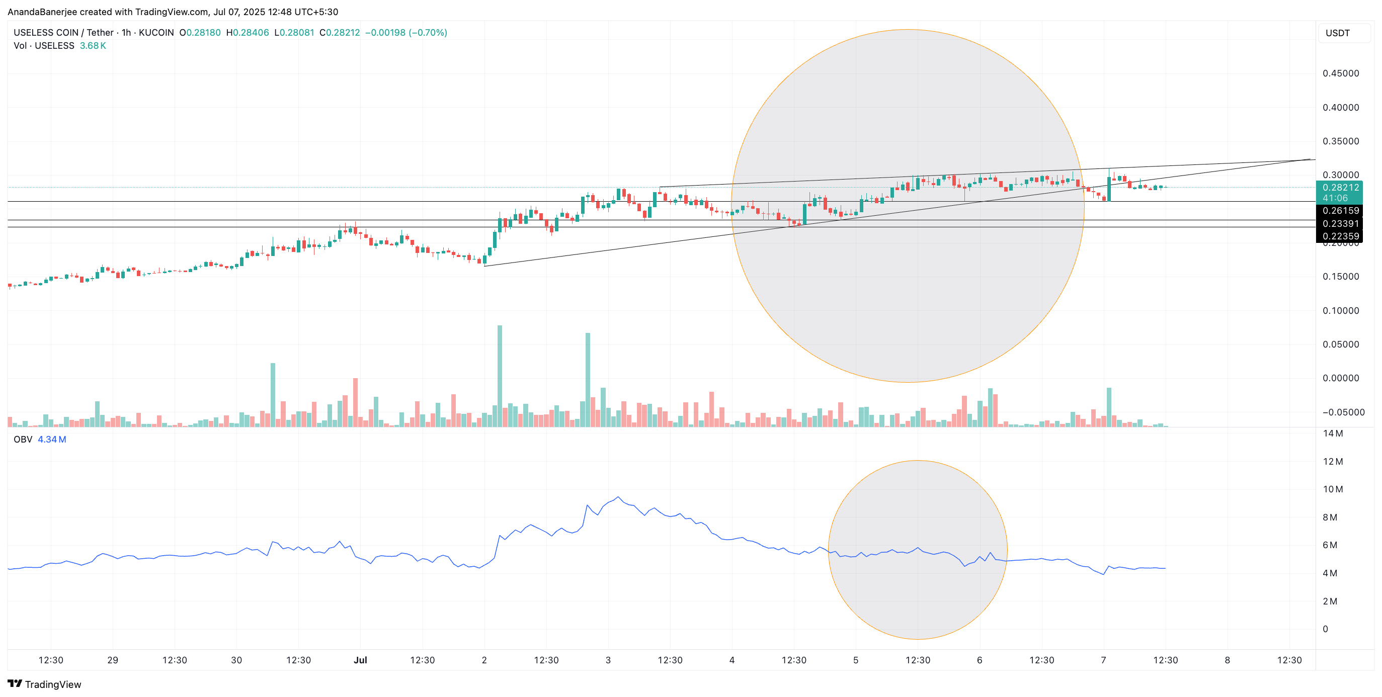 Denna struktur hjälper till att kartlägga risknivåerna om nedbrytningen fördjupas. Med ökande säljvolym och avtagande stöd ser USELESS sårbar ut under 0,28 USD.