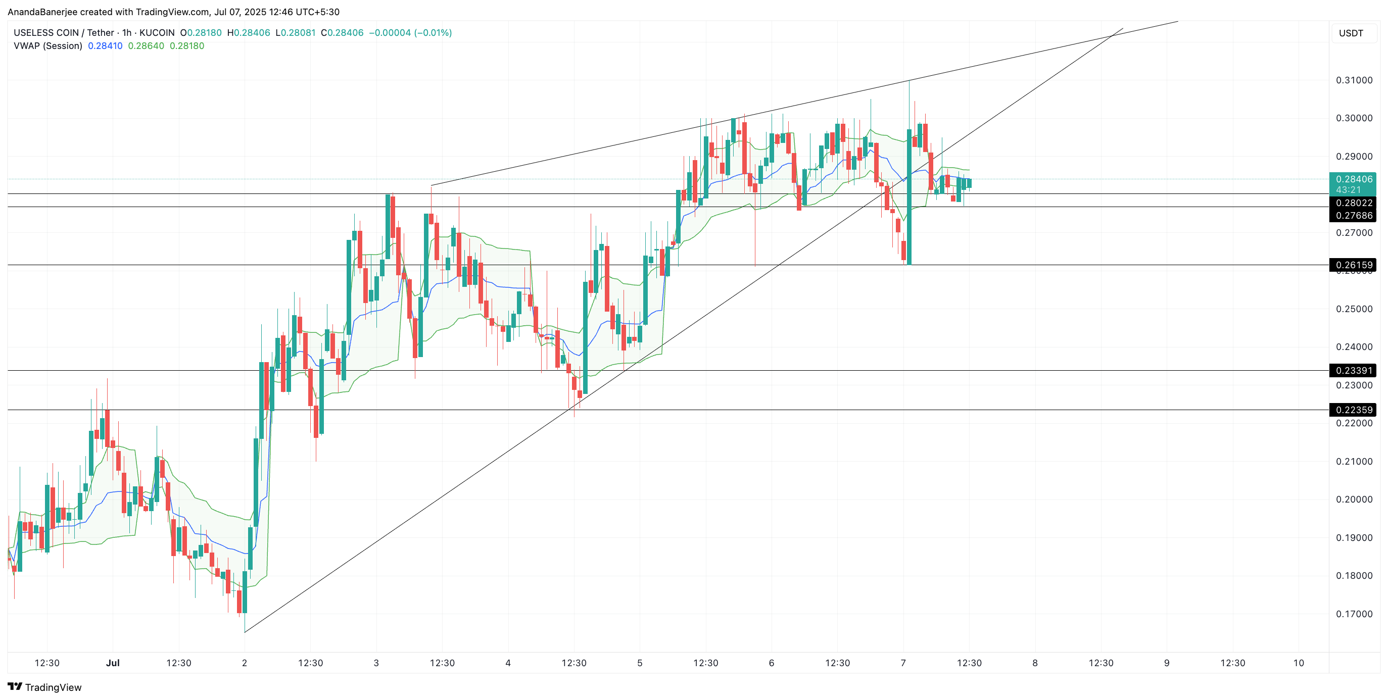 På prisdiagrammet bröt USELESS nyligen ner från en stigande triangel, en klassiskt baisseartad struktur. Avvisningen vid den övre trendlinjen, tillsammans med ett misslyckande att hålla Volume-Weighted Average Price (VWAP) stöd (0,2844 USD), öppnar nu upp utrymme mot nivåerna 0,2615 USD, 0,2339 USD och 0,2235 USD.