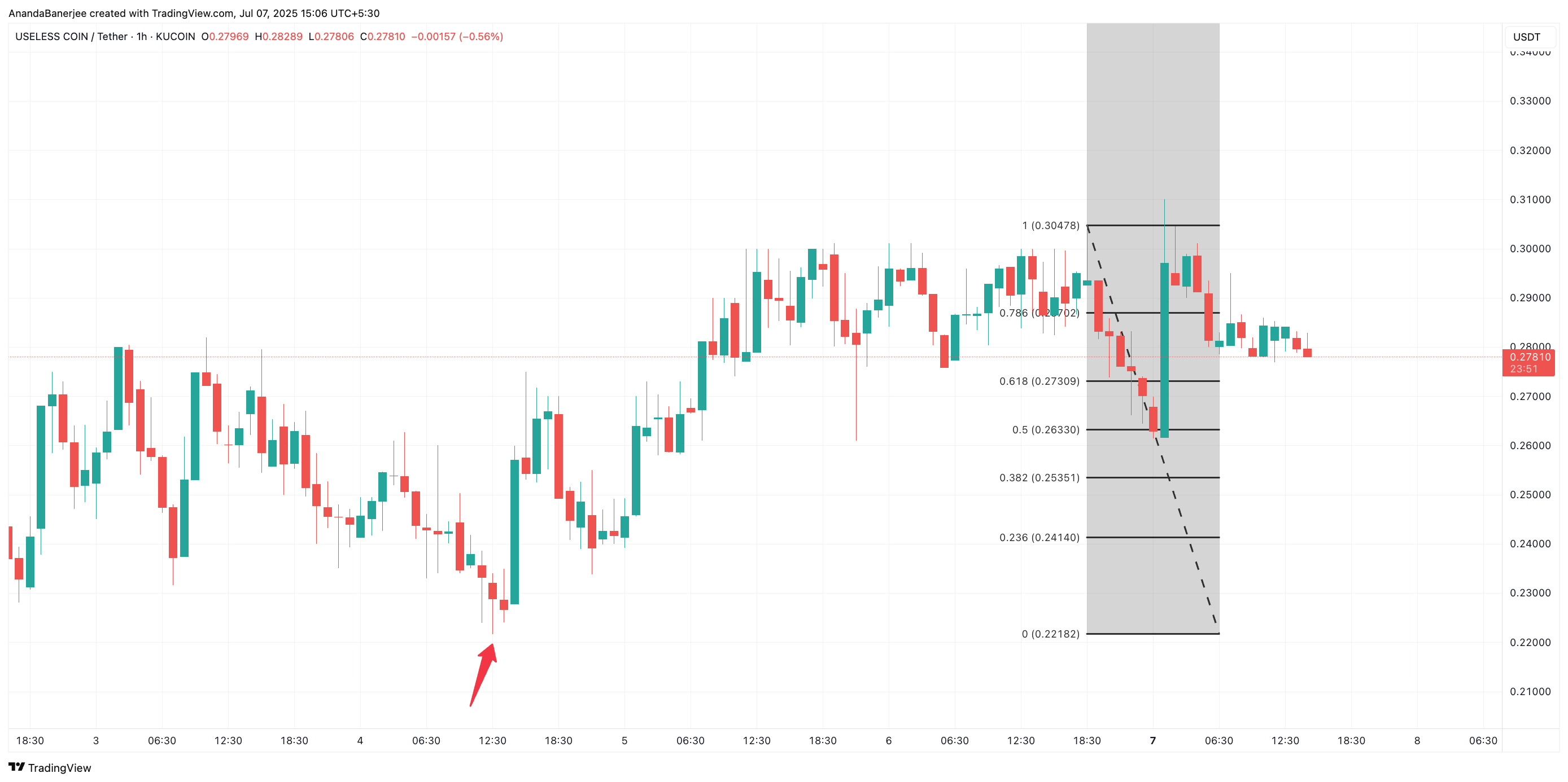 Fibonacci-retracementen ritades från 0,3047 USD (nyligen hög) till 0,2218 USD, vilket markerade den lägsta punkten innan uppgången började. Denna punkt valdes eftersom det var den sista stora nedgången innan köparna klev in; en tydlig lokal botten som bekräftar hela rörelsen.