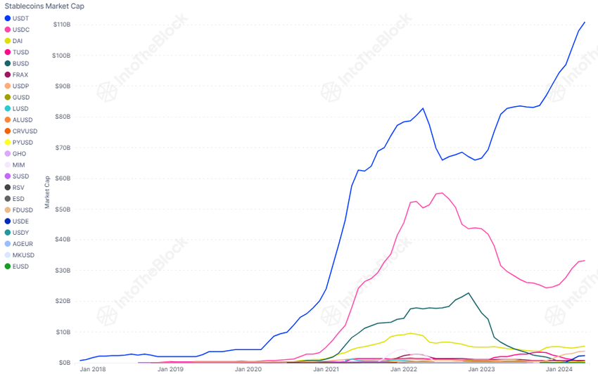 Data från IntoTheBlock visar att USDT, med ett marknadsvärde på 111 miljarder USD, står för drygt 70% av det totala marknadsvärdet för stablecoin. Däremot står den näst största stablecoinen, USDC, för endast 21%.