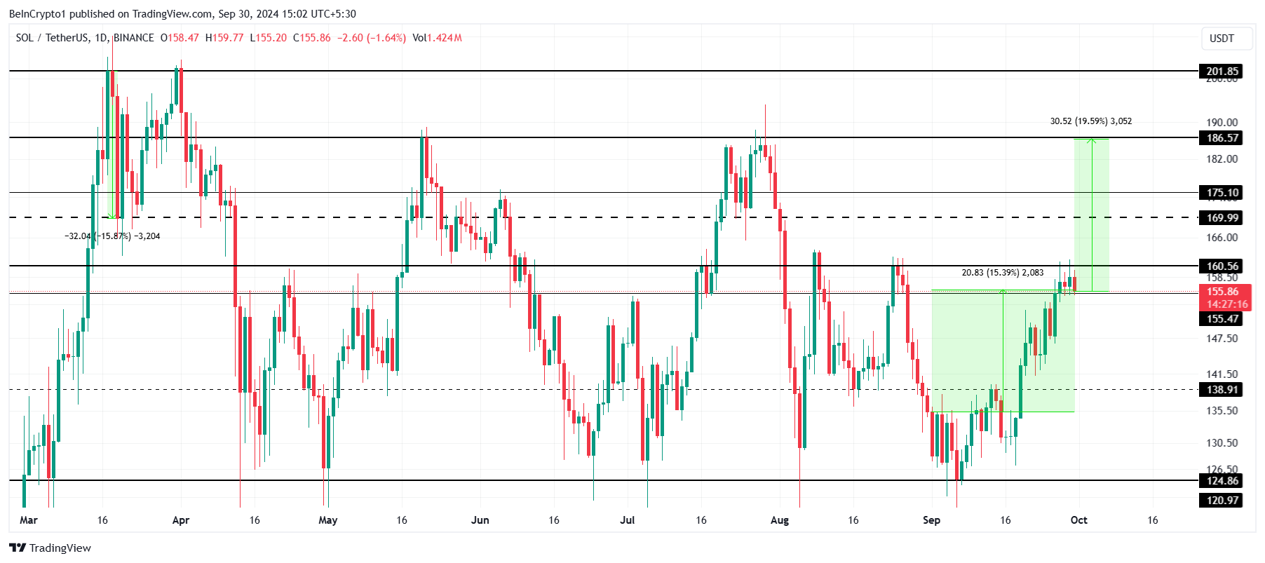 Solanas (SOL) pris har haft svårt att bryta sig över 160 USD under de senaste två månaderna, och har upprepade gånger misslyckats med att bibehålla momentum. Många på marknaden tror dock att “Uptober” kan medföra en vändning.