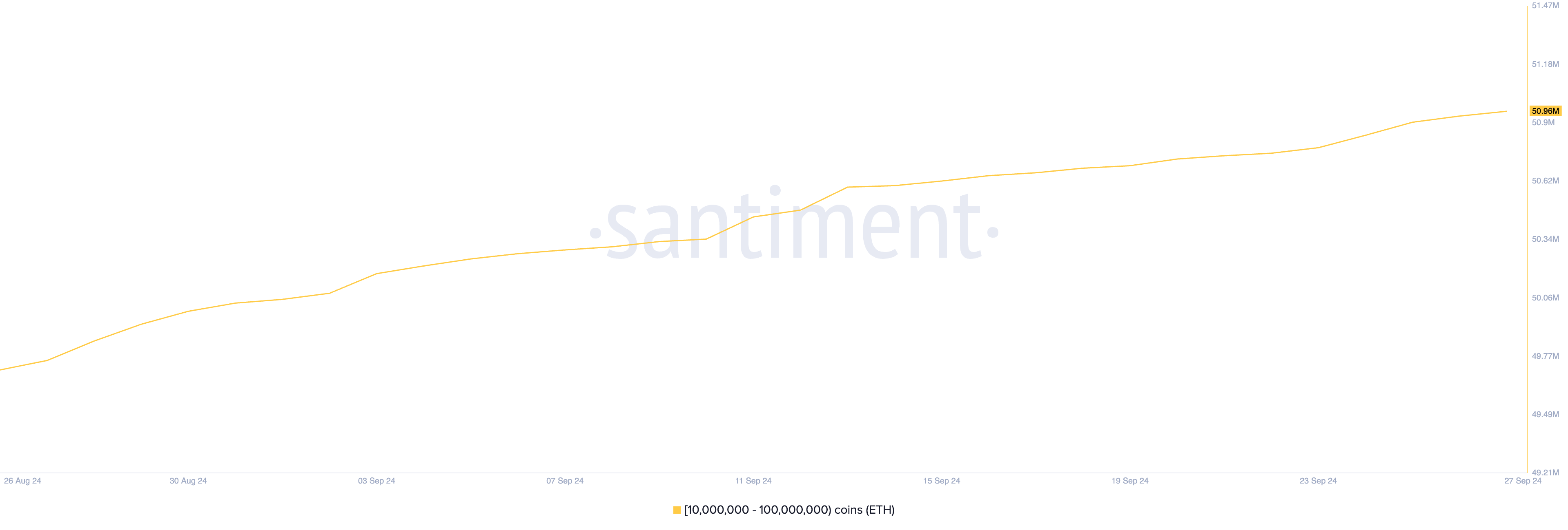 Ledande altcoin, Ethereum (ETH), är en av de tillgångar som dessa stora innehavare ackumulerar inför oktober. Enligt data från Santiment har det skett en märkbar ökning av ETH-ackumulering av plånboksadresser som håller mellan 10 miljoner och 100 miljoner ETH. Under de senaste 26 dagarna har denna grupp lagt till 910 000 ETH till sina innehav, värderade till över 2,40 miljarder USD till marknadspriser.