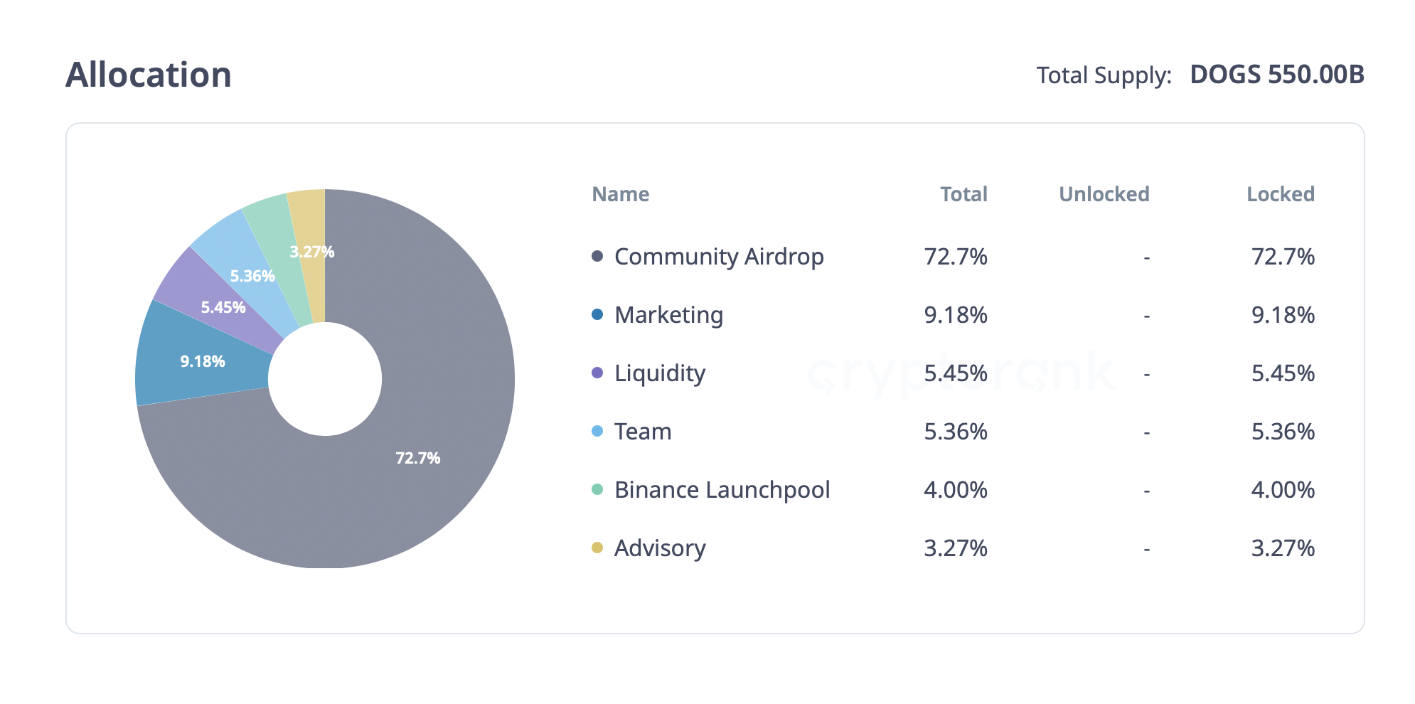 Tokenen har ett fast utbud på 550 miljarder DOGS. “Dogenomics” tilldelar 81,5% av tokenarna till gemenskapen, med 73% reserverade för långvariga Telegram-användare och resten distribueras till handlare och framtida gemenskapsmedlemmar. Eftersom det inte finns några låsningar eller vestingperioder, kan användarna handla eller använda sina DOGS omedelbart efter airdropen.