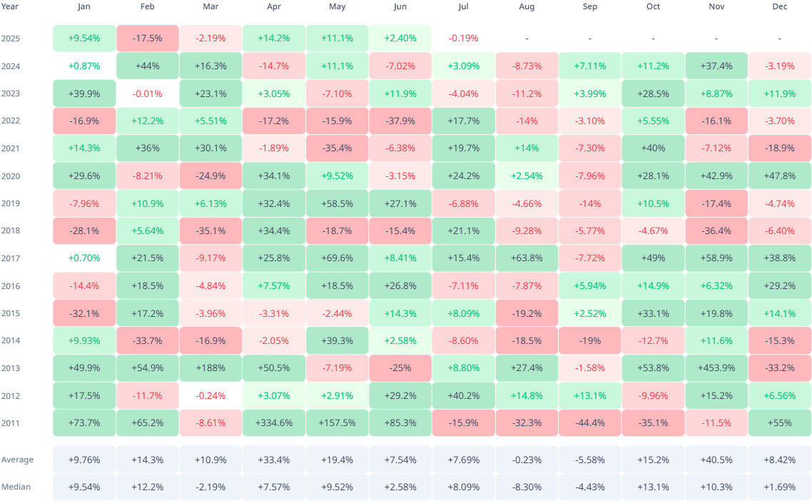 Bitcoin månadsavkastning. Källa: Cryptorank