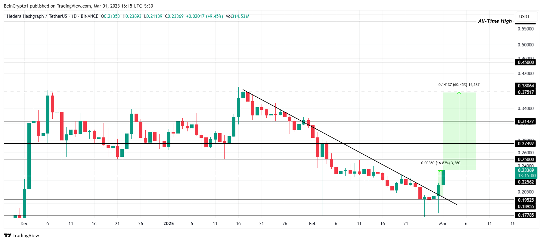 Nästa mål för HBAR är att återta förlusterna från mitten av januari till mitten av februari. För att göra det, skulle altcoinet behöva vända 0,27 USD till ett starkt stöd, vilket skulle tillåta det att fortsätta sin uppgång mot 0,37 USD.