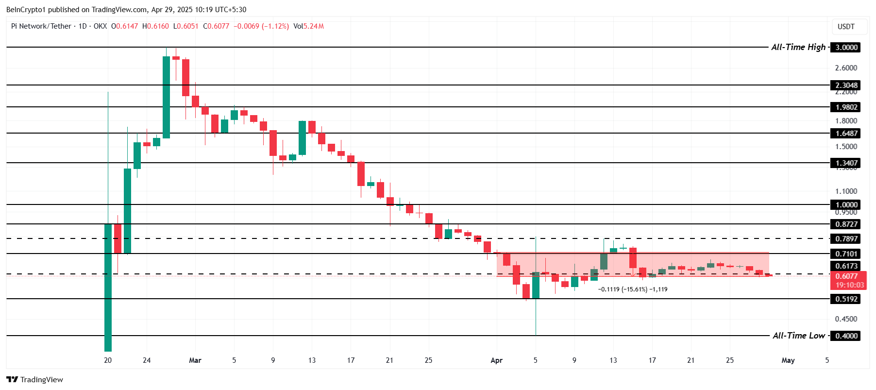 Om denna trend fortsätter och Bitcoins pris fortsätter att stiga kan altcoinet uppleva ytterligare en nedgång. Den negativa korrelationen med Bitcoin kan leda till att Pi faller genom 0,6077 USD-stödnivån och rör sig mot 0,5192 USD-stödet. Om trenden fortsätter kan altcoinet närma sig sitt lägsta värde någonsin på 0,4000 USD, vilket ytterligare fördjupar dess förluster.